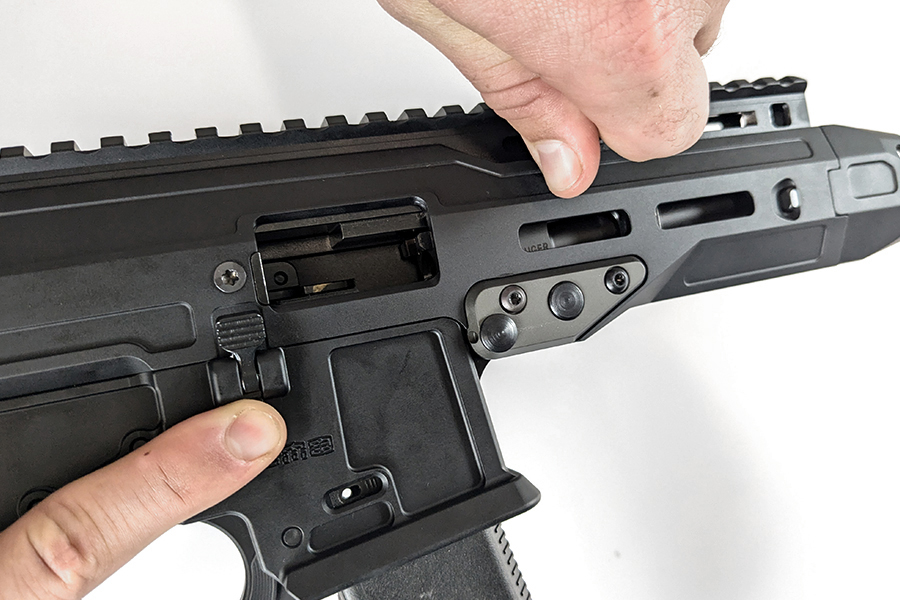 ![]() | 3. With a firm grip and your finger off the trigger, pull the charging handle all the way back to open and lock the bolt ensuring there is no cartridge in the chamber. | |